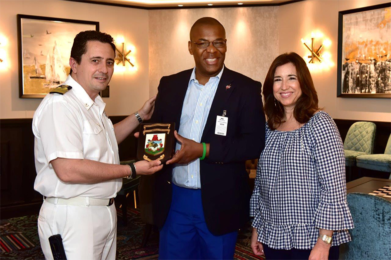 The traditional exchange of plaques for the inaugural visit included gifts from Bermuda, Wedco and the cruise line.