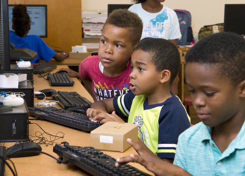 The STEAM academy concludes tomorrow evening (July 27) with a student exhibition and performance at the Ruth Seaton James Centre for Performing Arts. Gaming students have work stations set up to play games before the performance.