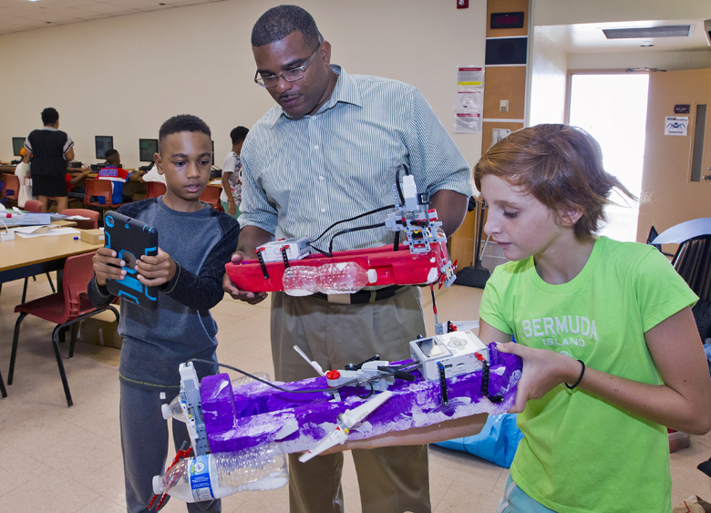 Minister Rabain met with students enrolled in the four-week course held at CedarBdridge Academy. Students have been in engaged in learning digibotics/robotics, performing arts, gaming and a renewable energy challenge.