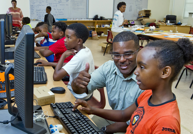 The STEAM academy concludes tomorrow evening (July 27) with a student exhibition and performance at the Ruth Seaton James Centre for Performing Arts. Gaming students have work stations set up to play games before the performance.